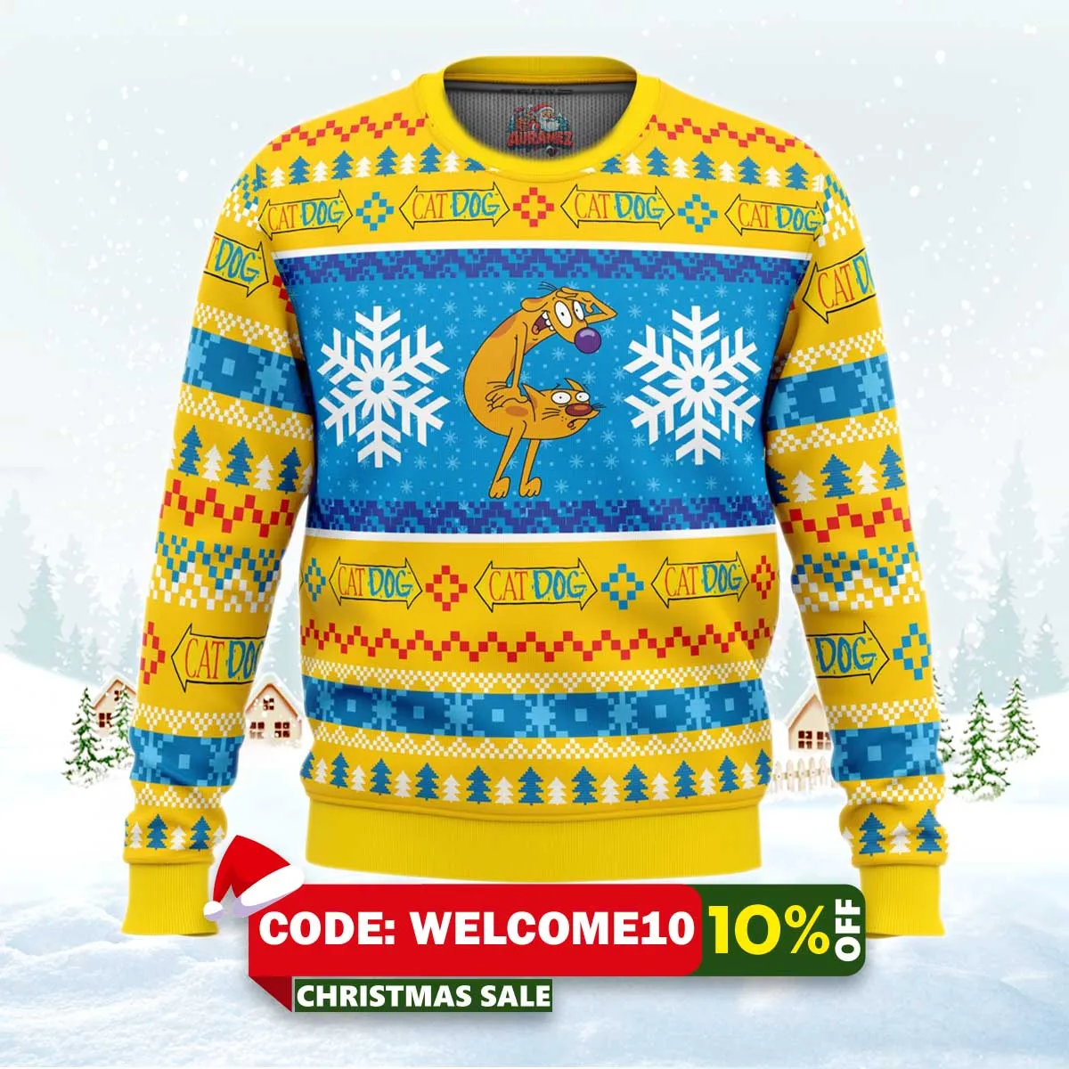 Celebrate the whimsical world of Catdog this Christmas! This sweater merges the beloved cartoon with festive flair, making it an ideal choice for holiday parties, family gatherings, or cozy nights by the fireplace.