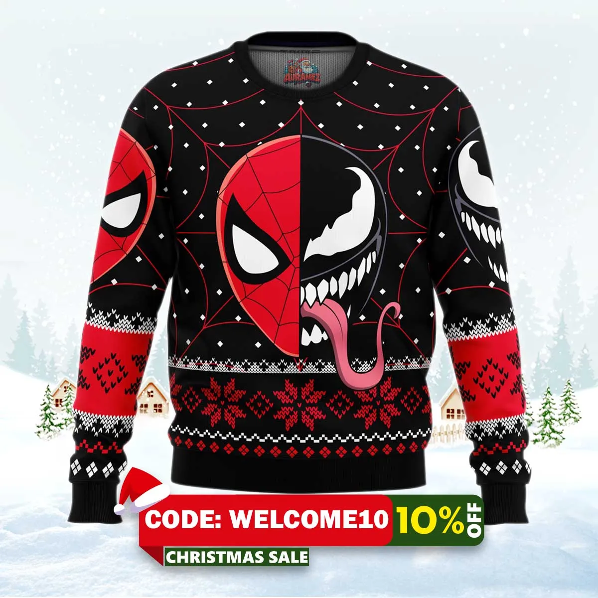 ⚠️ Limited stock available. Order your Christmas Spider Man Venom Marvel Comics Ugly Christmas Sweater today from Auramez.com and make this season unforgettable!