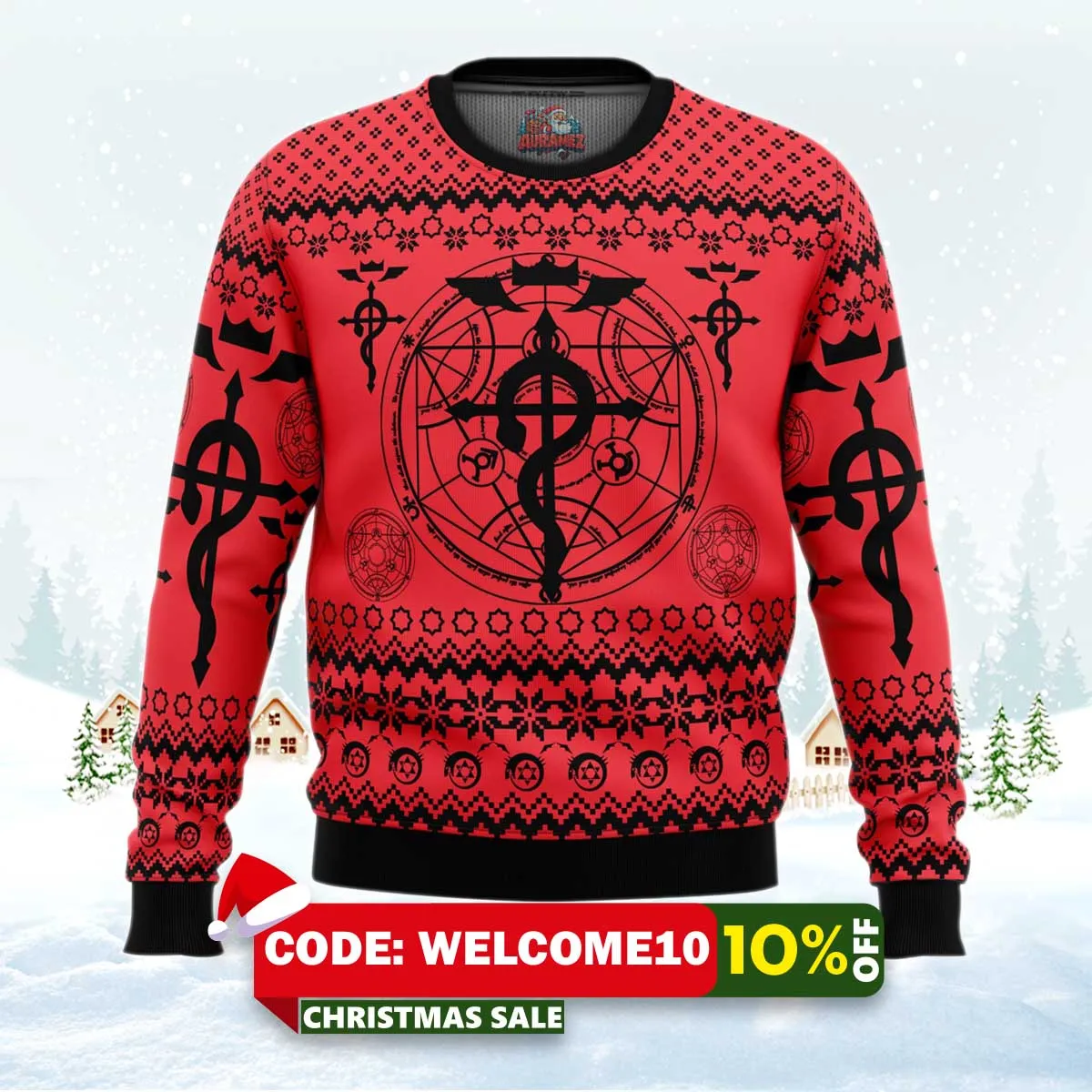 ⚠️ Limited stock available. Order your Flamel’S Cross X Transmutation Circle Fullmetal Alchemist Ugly Christmas Sweater today from Auramez.com and make this season unforgettable!