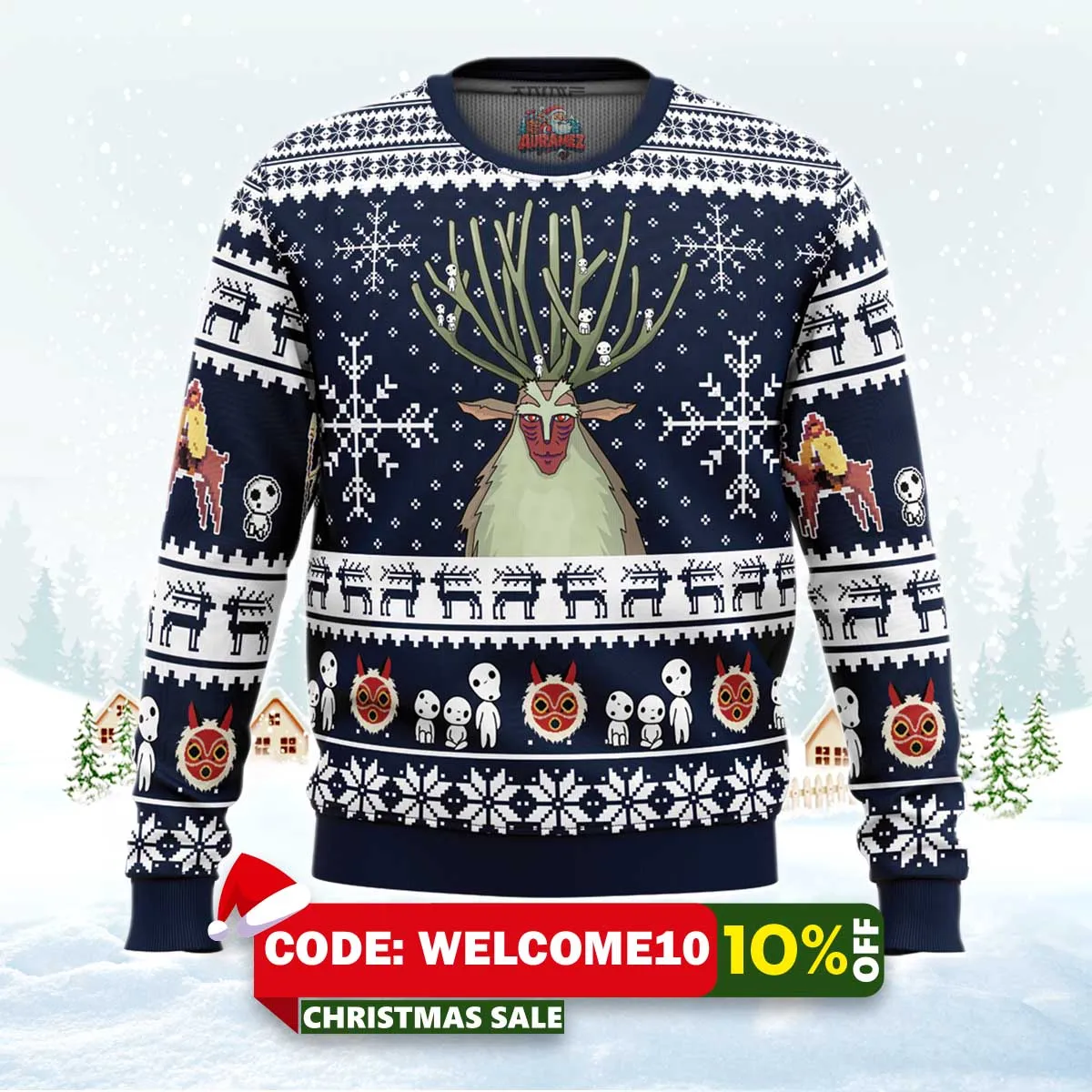 ⚠️ Limited stock available. Order your Forest Spirit Princess Mononoke Ugly Christmas Sweater today from Auramez.com and make this season unforgettable!