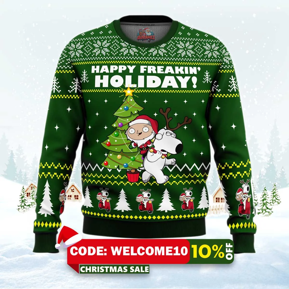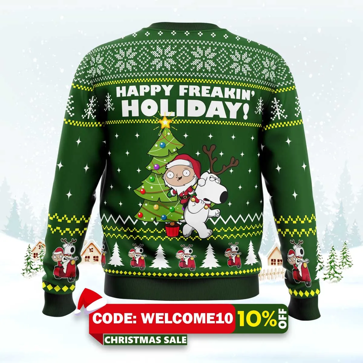 ⚠️ Limited stock available. Order your Happy Freakin Holidays Family Guy Sweater today from Auramez.com and make this season unforgettable!