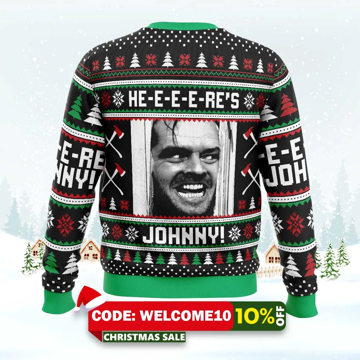 Tags: Here’S Johnny The Shining Ugly Christmas Sweater, The Shining sweater, funny ugly sweater, holiday gift idea, party outfit