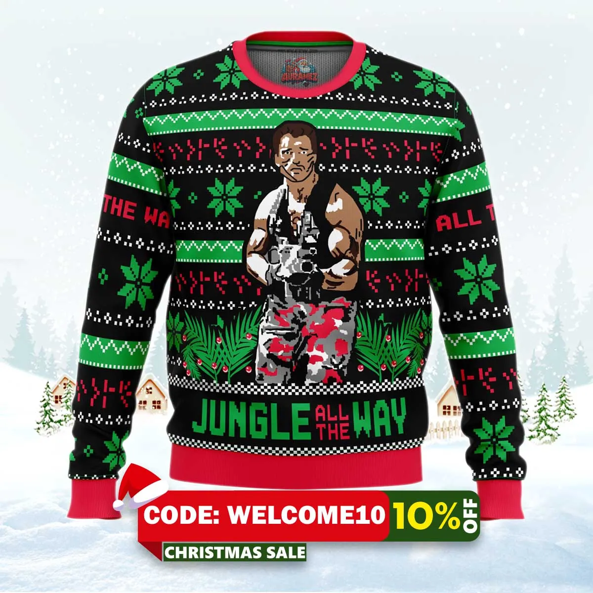 ⚠️ Limited stock available. Order your Jungle All The Way Arnold Schwarzenegger Ugly Christmas Sweater today from Auramez.com and make this season unforgettable!
