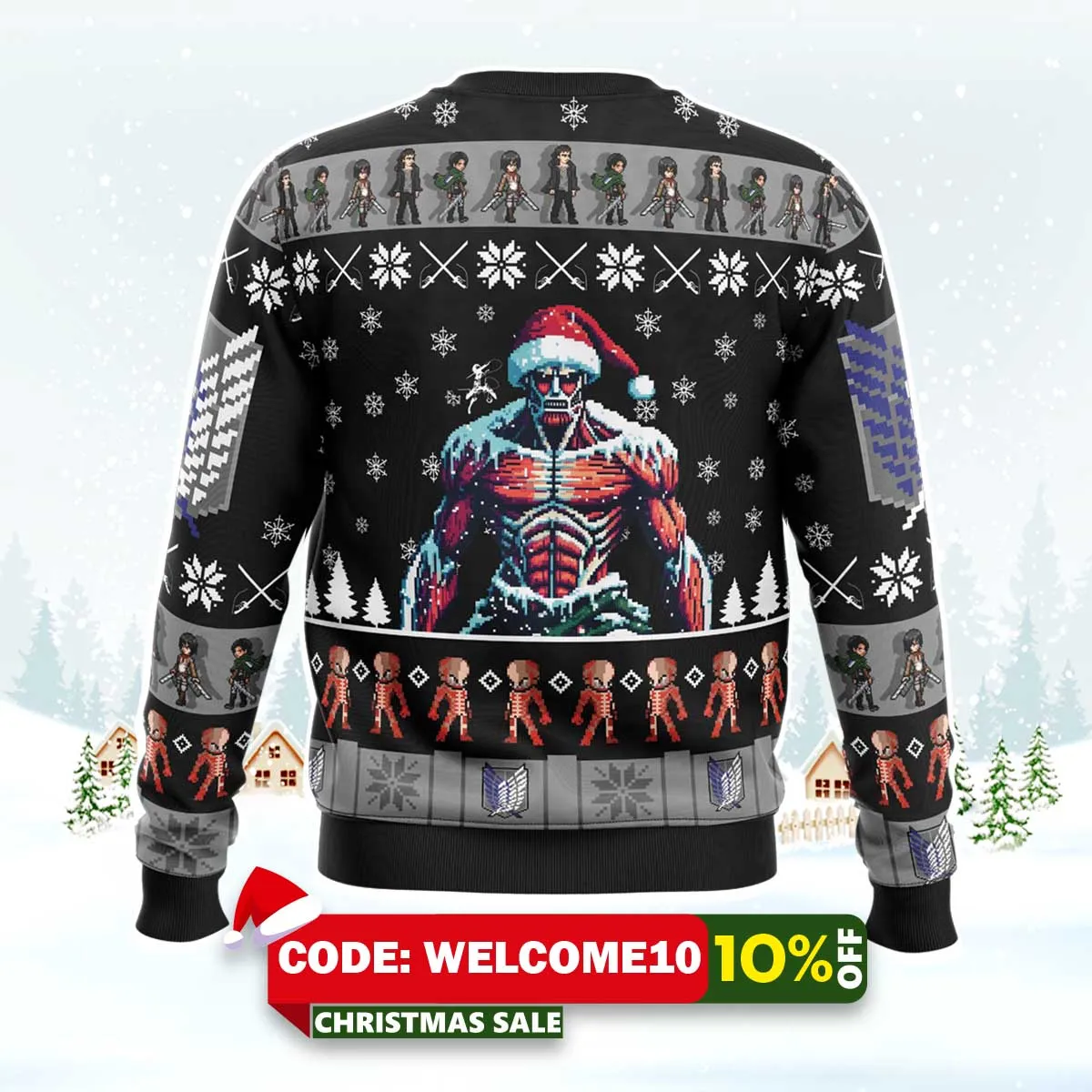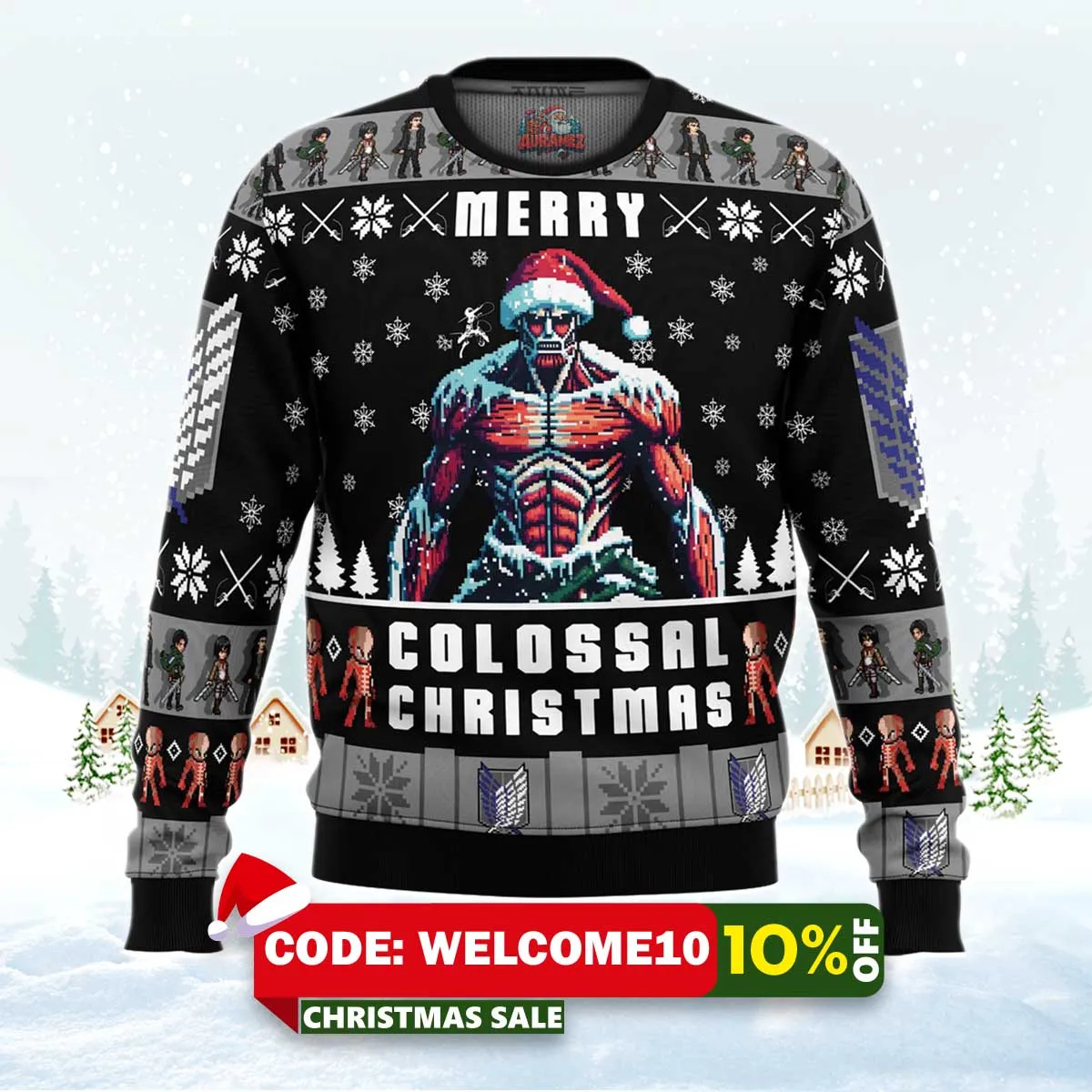 ⚠️ Limited stock available. Order your Merry Colossal Christmas Attack On Titan Ugly Christmas Sweater today from Auramez.com and make this season unforgettable!
