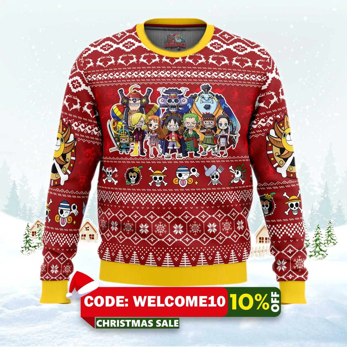 Get ready to celebrate the festive season with the Merry Mugiwara Pirates One Piece Ugly Christmas Sweater! This playful and cozy sweater brings together the excitement of the holiday season and the adventurous spirit of the beloved One Piece anime. Perfect for cozy gatherings or spirited holiday parties, this sweater is a must-have for every fan of the Mugiwara crew!