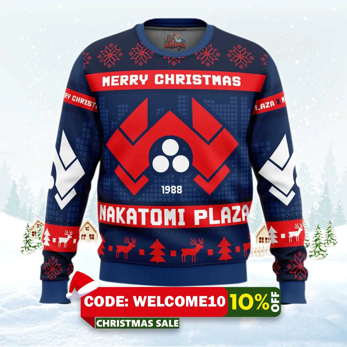 ⚠️ Limited stock available. Order your Nakatomi Plaza Die Hard Ugly Christmas Sweater today from Auramez.com and make this season unforgettable!