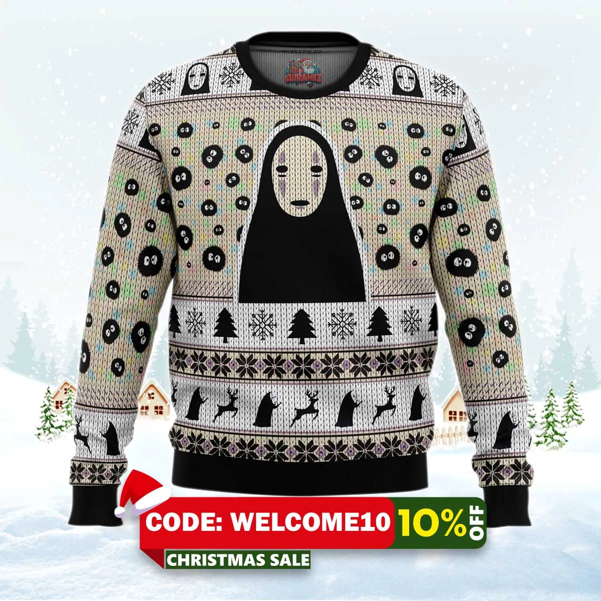 ⚠️ Limited stock available. Order your No Face And Soot Sprites Spirited Away Studio Ghibli Ugly Christmas Sweater today from Auramez.com and make this season unforgettable!