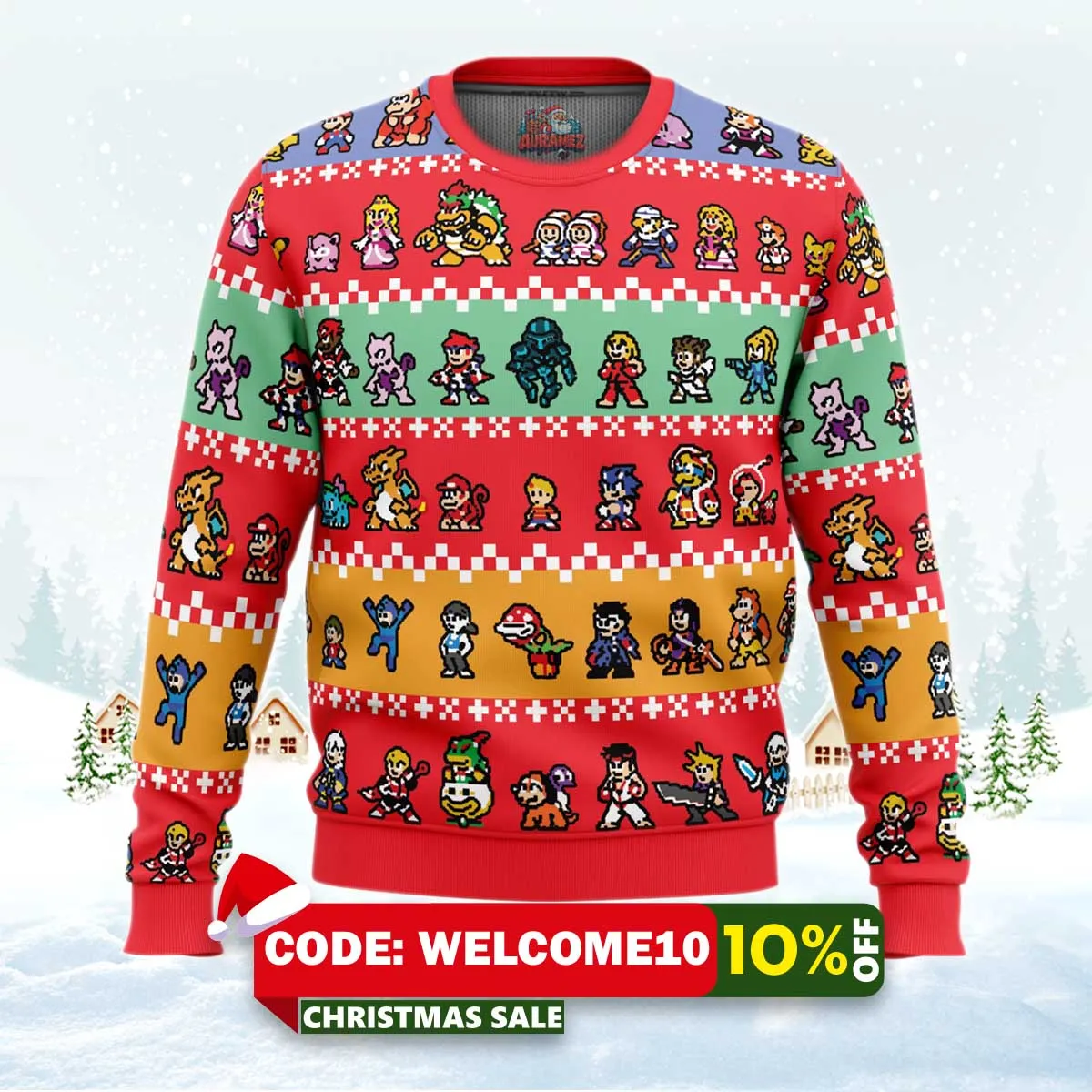 ⚠️ Limited stock available. Order your Pixel Smash Super Smash Bros Ugly Christmas Sweater today from Auramez.com and make this season unforgettable!