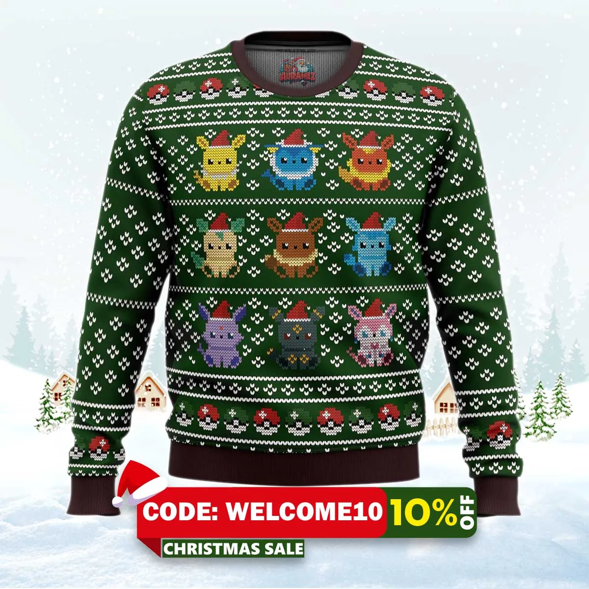 ⚠️ Limited stock available. Order your Pokemon Eevee Eeveelutions Ugly Christmas Sweater today from Auramez.com and make this season unforgettable!