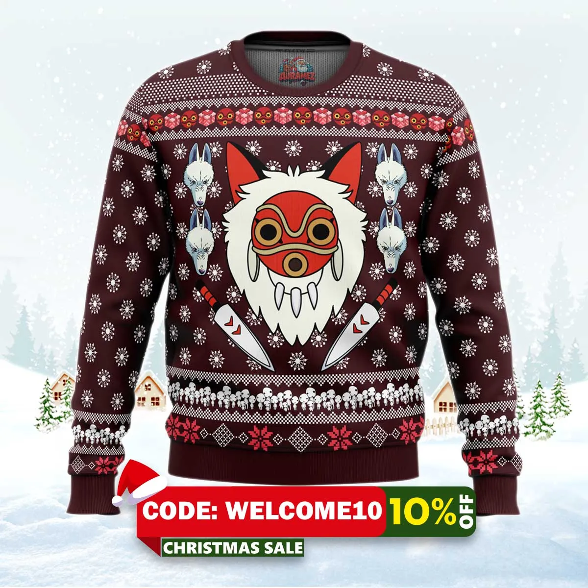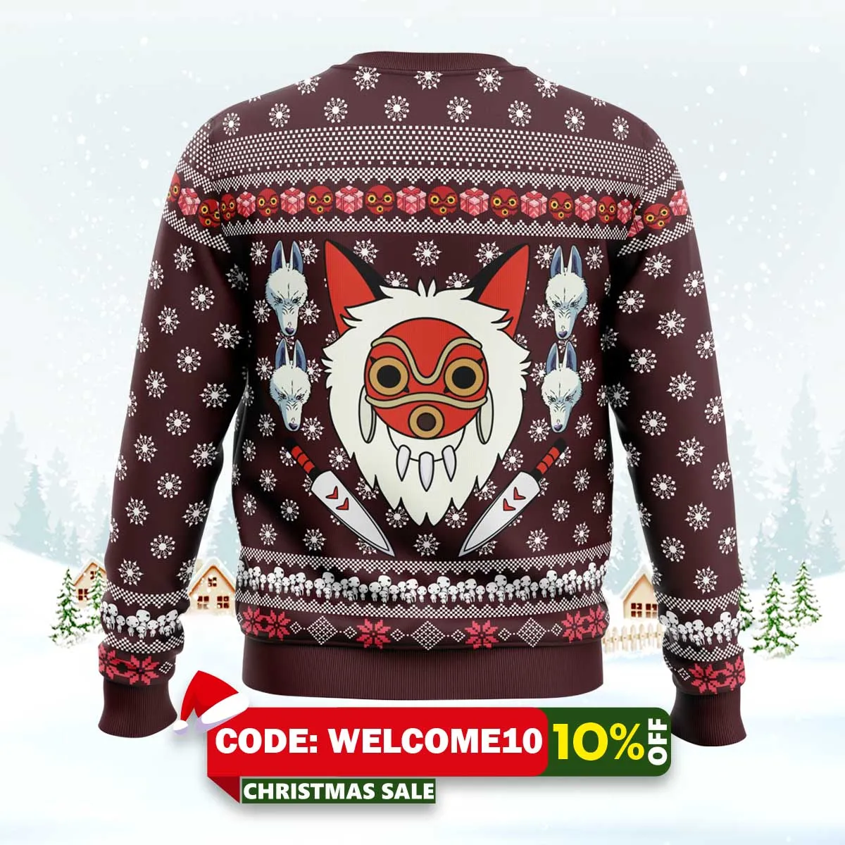 Tags: Princess Mononoke Ugly Christmas Sweater, Princess Mononoke sweater, funny ugly sweater, holiday gift idea, party outfit
