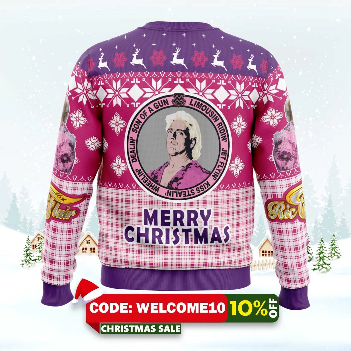 Get ready to style with flair this holiday season in our Ric Flair WWE Ugly Christmas Sweater! Perfect for wrestling fans and holiday revelers alike, this cozy sweater combines festive cheer with the iconic flair of wrestling legend Ric Flair. Whether you’re decking the halls or heading to a holiday party, this sweater is sure to make you the life of the celebration!