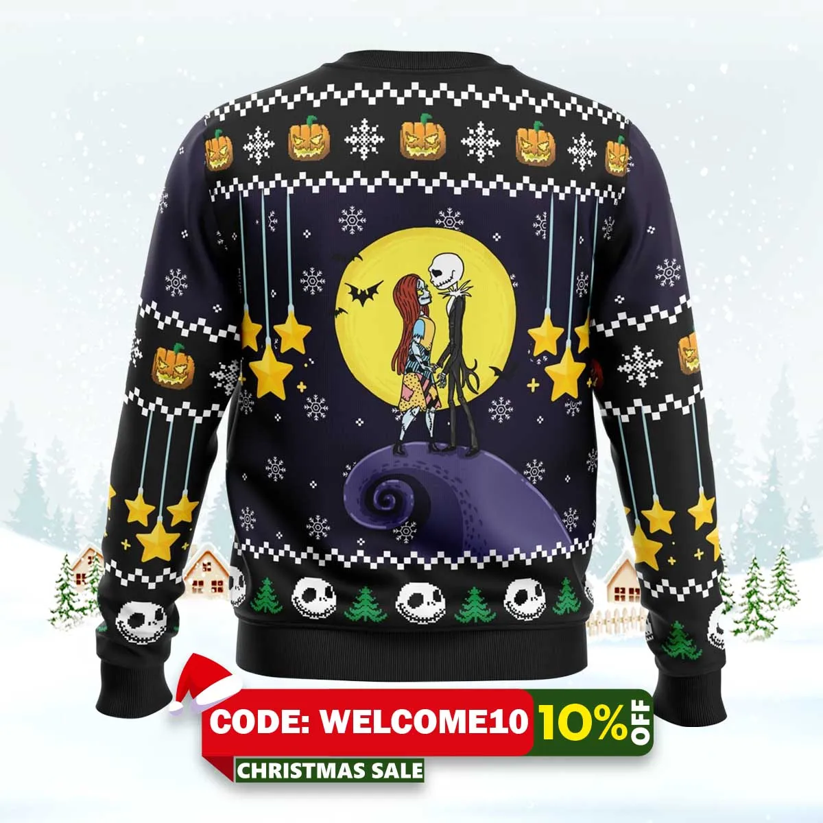 Get ready to bring the enchanting world of Halloween Town to your holiday celebrations! The Romantic Nightmare The Nightmare Before Christmas Ugly Christmas Sweater embodies the spirit of both Halloween and Christmas, making it a unique addition to your festive attire.