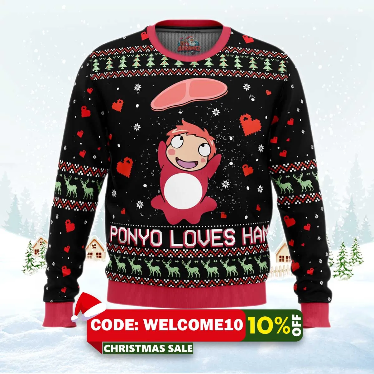⚠️ Limited stock available. Order your Studio Ghibli Ponyo Loves Ham Miyazaki Ugly Christmas Sweater today from Auramez.com and make this season unforgettable!