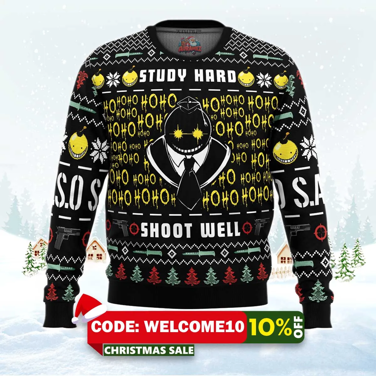⚠️ Limited stock available. Order your Study Hard Shoot Well Assassination Classroom Ugly Christmas Sweater today from Auramez.com and make this season unforgettable!
