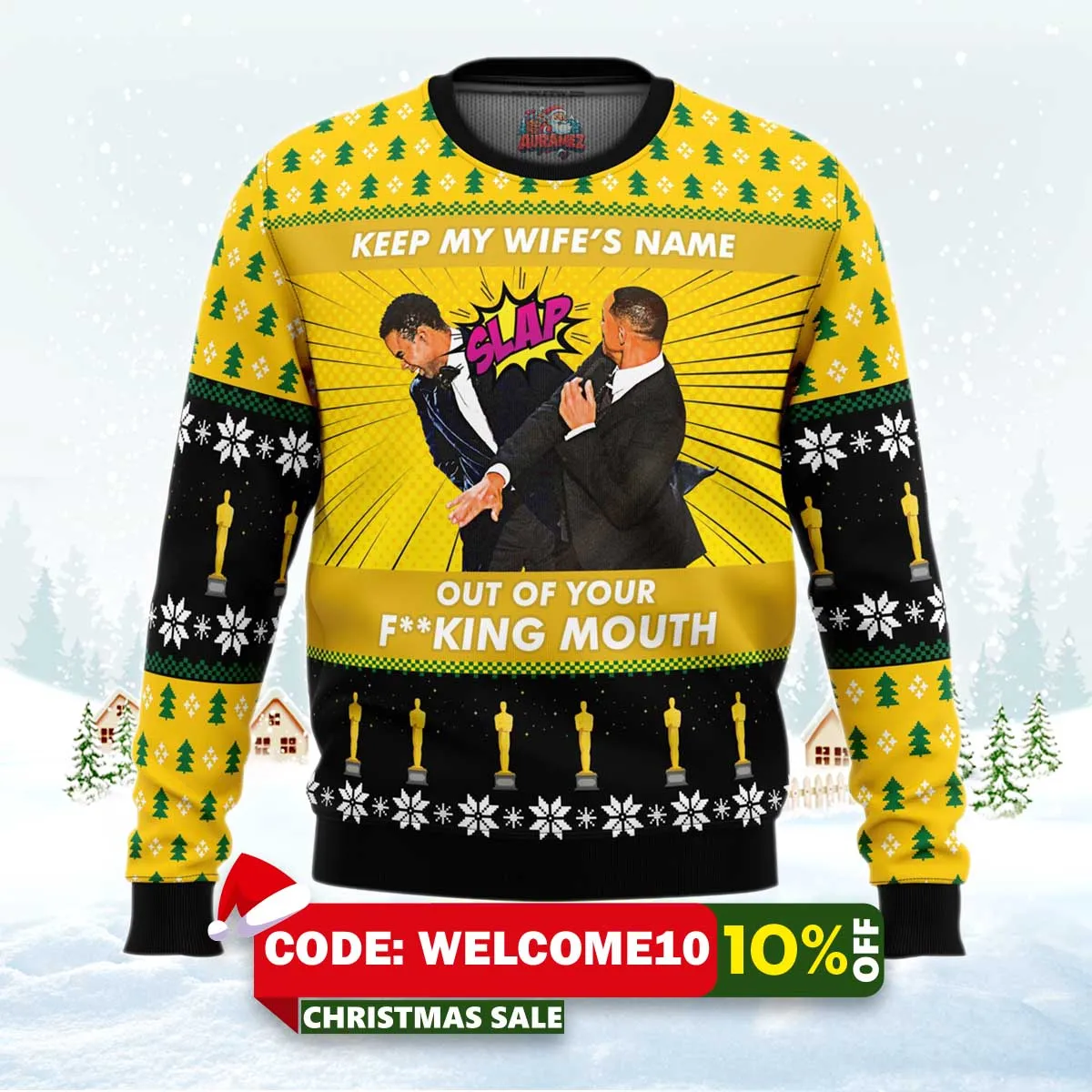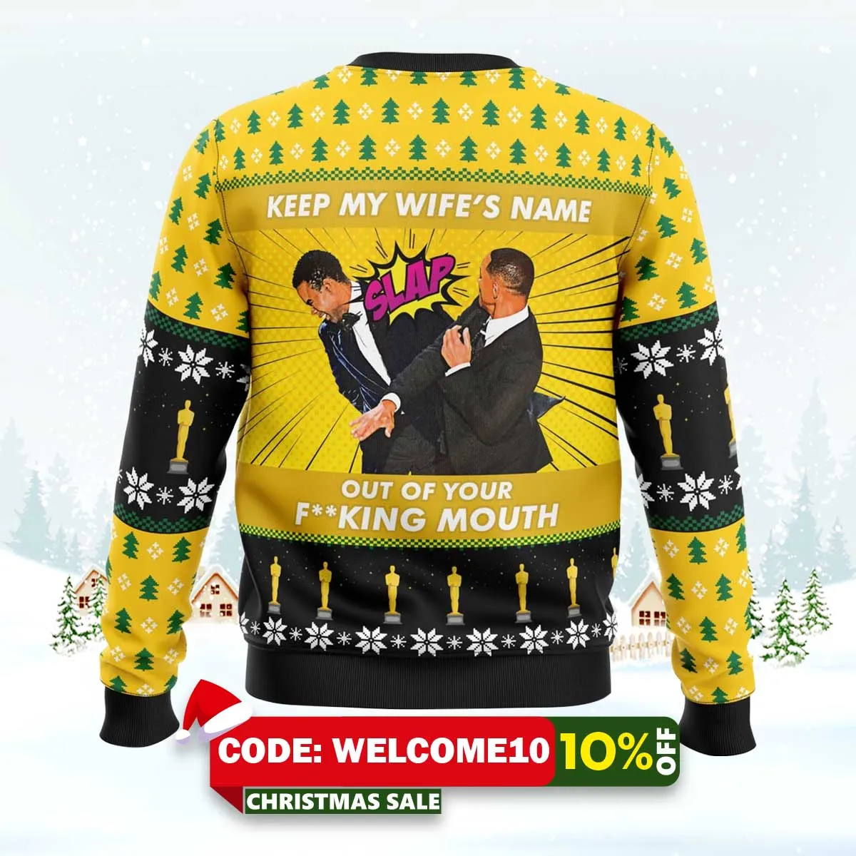 ⚠️ Limited stock available. Order your Will Smith Slaps Chris Rock Meme Ugly Christmas Sweater today from Auramez.com and make this season unforgettable!
