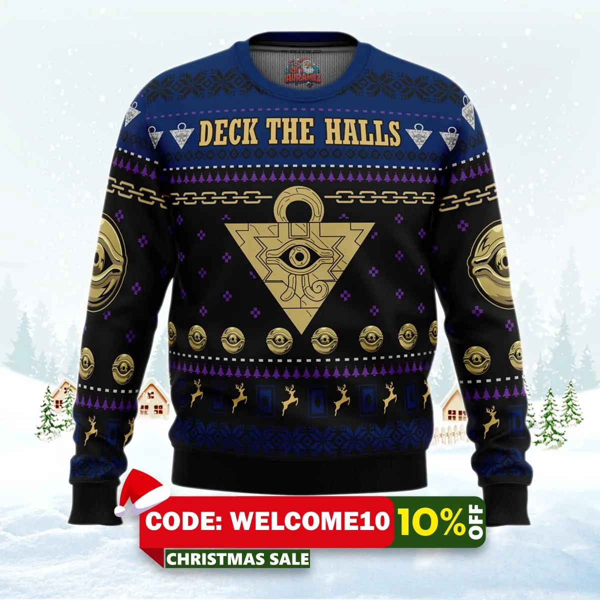 Tags: Yugioh Deck The Halls Ugly Christmas Sweater, Yu-Gi-Oh sweater, funny ugly sweater, holiday gift idea, party outfit